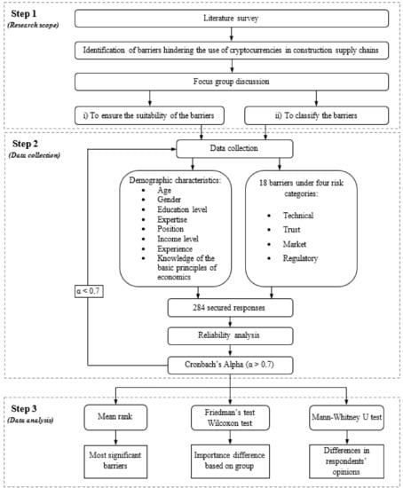 To achieve the objectives of the study, an exploratory research strategy was first pursued by means of a comprehensive literature survey. However, because the literature about the barriers against using cryptocurrencies in construction supply chains is rather limited, this was followed by a descriptive research strategy that involved a focus group discussion where (1) the barriers against using cryptocurrencies were classified into four categories, namely technical, trust, market, and regulatory; and (2) a questionnaire was prepared to seek the opinions of construction professionals about the use of cryptocurrencies in construction supply chains. Finally, an empirical research strategy was used to administer a survey to construction professionals and to analyze the data collected (i) to identify the most significant barriers; (ii) to conduct the Friedman and Wilcoxon tests to find whether the mean ranks of barriers in each barrier category are statistically different or not; and (iii) to perform the Mann–Whitney U test to examine differences in respondents’ opinions with respect to their expertise, knowledge of basic principles of economics, and experience in the use of cryptocurrencies. Overall, this study is expected to contribute to the literature about payment practices in construction supply chains, and in particular about the use of cryptocurrencies in this process. The impact is expected to be particularly pronounced in the building construction industry that involves a multitude of suppliers providing materials to the contractor.