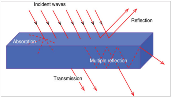 Understanding electromagnetic shielding mechanisms is important, guiding the significance of shielding materials’ development. EM shielding is the process of lowering the electromagnetic field, blocking the field with barriers made of conductive materials [8]. Shielding is the sum of absorption and reflection loss and multiple reflections [9,10]. To be a shield against the EM, material should reflect or absorb the wave [11]. The mechanism of electromagnetic shielding is shown in Figure 2.