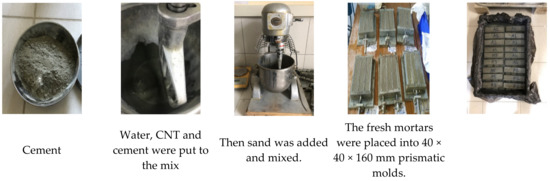 The nanomaterial CNT from the mixture was varied from 0.25%, 0.5%, to 1%. The mix proportion of mortar is seen in Table 4. Firstly, CNT were sonicated in water for 1 min. Then cement was added, blended for 30 s. Sand was put mortar mixture. Mortars were placed into 40 × 40 × 160 mm molds. After 28 days of curing, compressive strength, water absorption, ultrasonic pulse velocity, flexural strength, the electromagnetic shielding of the samples was determined.