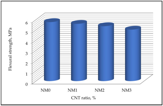Flexural strength was in the range of 5.03–5.77 MPa. The specimen NM1 showed similar strength to NM0. The results prove that flexural strength results are almost close with those of the NM0 except MN3.
