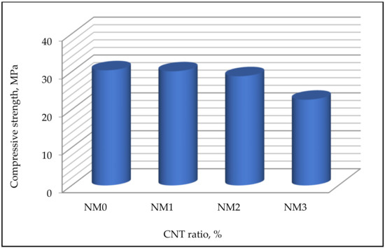 The compressive strength of mixtures at 28 day of curing are shown in Figure 8. Strength results NM0 and NM1 mixtures are consistently lower than NM2 and NM3 mixtures. The strength results of NM2 and NM3 were lower than mixtures NM0 and NM1. Particularly, when the amount of CNT increased, the strengths decreased because CNT is a hydrophobic composite. Water absorption percentages of mortars is shown in Figure 8.