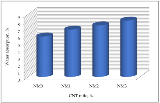 Figure 8 shows that NM0 had the highest water absorption compares to NM1, NM2, NM3. Water absorption values increases significantly with the NM0. When the results were compared to NM0, the effect of the amount of the CNT on the water absorption of the mixture was negative.