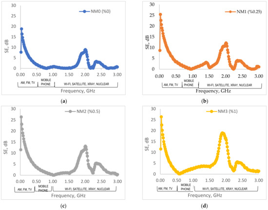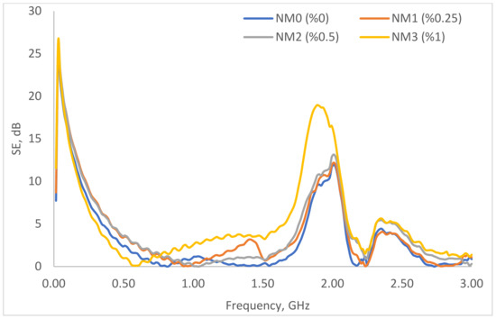 Electromagnetic tests were carried out within 0 GHz to 3 GHz. The maximum EM shielding was obtained at a frequency of 2 GHz, when the CNT was 1%. Addition of CNT into the cementitious matrix increased the EM of the composite. The addition of CNT into cementitious material has shown a significant increase in NM3. All mortars had peaks at 2 and 2. 40 GHz (Figure 9). The SE was the highest at about 2 GHz for all specimens. The mortars had the highest EMI shielding effect at a frequency of 2 GHz and 2.5 GHz. The incorporation of CNT nanomaterial into the mixture led to an improved EM. In Figure 9a, it was confirmed by comparing NM0, and the shielding effectiveness of NM3 improved compared to NM0 (Figure 10). The CNT improved the shielding effectiveness, owing to the carbon content in the CNT.