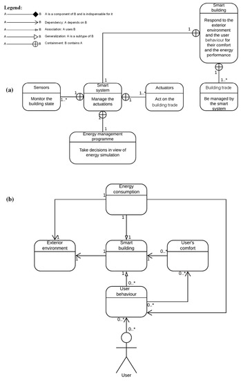 - Block definition diagram: Aims to specify system static structures that will be used for objects. It represents system components and their contents, interfaces and relationships. Figure 3b shows a smart building as being dependent on the exterior environment (meteorological data, etc.) and using energy consumption and user behavior data for managing building energy. User behavior is impacted by comfort, which, in turn, depends on energy settings that are tuned and monitored by the smart building.