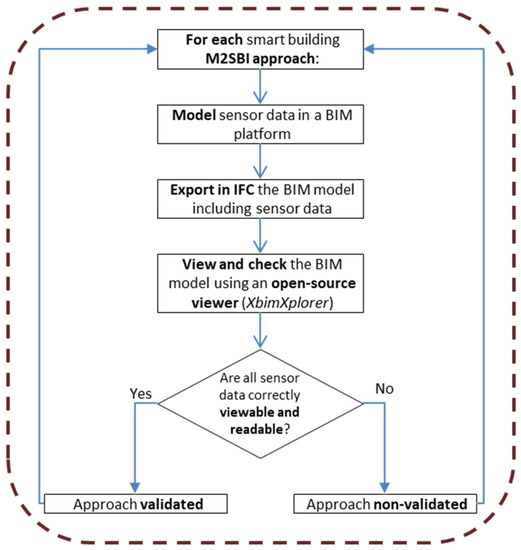 Figure 4 shows the validation methodology used to evaluate the different approaches for the modelling and managing of smart building information (M2SBI). For each M2SBI approach, sensor data is first modelled using a BIM authoring platform (Autodesk REVIT in this instance). The BIM model was then exported in IFCs including smart building information and sensor data. The viability and correctness of IFC exports was tested in an IFC viewer that was different from the modelling software that was used to develop the BIM model. In this study, XbimXplorer, which is an open-source viewer that displays both the geometry and semantic data of IFC-based BIM models, was used. Each M2SBI approach is validated based on whether the correct smart building data is viewable and readable within the XbimXplorer platform.