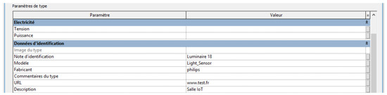 With advanced IFC export configuration, it is possible to specify the family and type of object as an IFC-exportable reference. That said, as shown in Figure 6, most data are not exported (‘Note d’identification: Luminaire 18’, ‘Modèle: Light_Sensor’, ‘URL: www.test.fr’ and ‘Description: Salle IoT’) because family and type alone are not enough to describe the sensor.