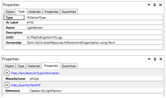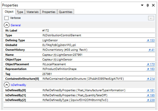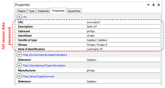 As shown in Figure 11, sensor data were represented and modelled using property sets according to prototype 3 (see Section 5.2.4 above) and subsequent updates were ensured through a Dynamo script. They were implemented in Autodesk REVIT and exported using IFCs. After checking the IFC model in the XbimXplorer platform, all relevant data were found to have been successfully exported since they were still correctly viewable and readable without any loss of information and, consequently, the proposed process for representing and exchanging smart building information was successfully tested in a real-world case study.