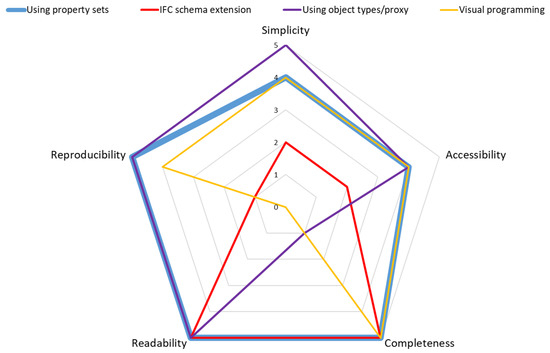 Using averages of scores given by the reviewer to each prototype, the results are shown in Figure 8. The third approach using ‘property sets’ was the preferred solution due to its greater development simplicity, development requirement and accessibility compared to the other prototypes. This selected option is demonstrated in Section 6.