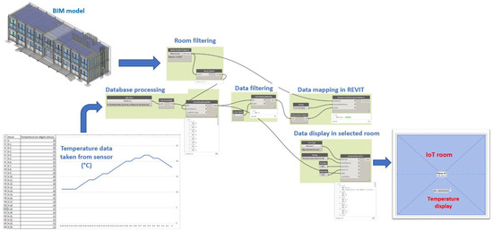 To visualise the data, the BIM model must be connected to the database related to the IoT sensors. Nevertheless, Dynamo has some limits. For instance, interaction times seem to be longer than with other solutions, such as Rhino-Grasshopper-based solutions [49]. Other more intuitive visualisation tools (e.g., BIM VCAD, edited by BIM services) offer BIM-connected dashboards that easily present data taken from temperature, light, occupancy or humidity sensors.