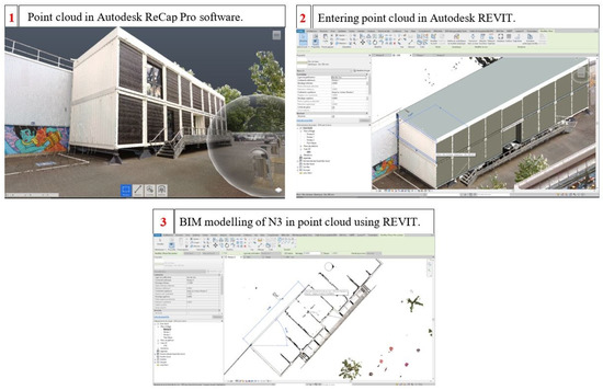 Modelling the N3 building, including its operational conditions, requires the creation of its object-based systematic design (as defined above in Section 5 and shown in Figure 3e), which comprised the following: (1) solid elements, such as walls and floors; (2) empty spaces, such as rooms; and (3) smart systems and associated sensors. Despite the building having been built in 2017, it did not have a BIM model. This is often the case with many older buildings and would require a BIM model to be built retrospectively if it were to be part of the technical solution for smart operation and maintenance. Figure 10 illustrates the process of creating the BIM model for the N3 building and its components, which is a well-known and established process for such cases. First, a FARO scanner was used to create a 3D model that established the exact position of the building’s components in space. Next, the scan data was uploaded as a point cloud into BIM modelling software that was IFC-export certified (i.e., that can export data in IFC format). In this case, Autodesk REVIT was used. Finally, all the components and spaces mentioned above were modelled on top of the point cloud to create an as-built BIM model that included both sematic and geometric data.