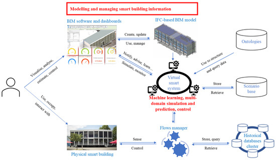 Buildings have a significant impact on energy consumption and carbon emissions. Smart buildings are deemed to play a crucial role in improving the energy performance of buildings and cities. Managing a smart building requires the modelling of data concerning smart systems and components. While there is a significant amount of research on optimising building energy using the smart building concept, there is a dearth of studies investigating the modelling and management of smart systems’ data, which is the starting point for establishing the necessary digital environment for representing a smart building. This study aimed to develop and test a solution for modelling and managing smart building information using an industry foundation classes (IFCs)-based BIM process. A conceptual model expressed in the SysML language was proposed to define a smart building. Five BIM approaches were identified as potential ‘prototypes’ for representing and exchanging smart building information. The fidelity of each approach is checked through a BIM-based validation process using an open-source visualisation platform. The different prototypes were also assessed using a multi-criteria comparison method to identify the preferred approach for modelling and managing smart building information. The preferred approach was prototyped and tested in a use case focused on building energy consumption monitoring to evaluate its ability to manage and visualise the smart building data. The use case was applied in a real case study using a full-scale demonstrator, namely, the ‘Nanterre 3’ (N3) smart building located at the CESI campus in Paris-Nanterre. The findings demonstrated that an open BIM format in the form of IFCs could achieve adequate modelling of smart building data without information loss. Future extensions of the proposed approach were finally outlined.