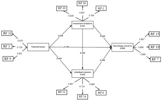 | H4 | Individual/Worker’s concern risk–Technology concerns risk | 0.406 | 0.204 | 1.989 | 0.047 ** | Supported | 0.255 | Moderate |