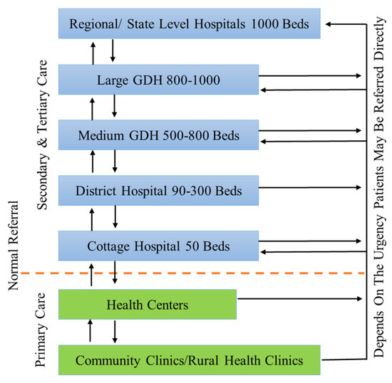 The Malaysian healthcare system has been subject to continuous development with the goal of achieving a higher-quality healthcare service. Healthcare facilities have been distributed according to the forecasted population density. According to the Malaysian Ministry of Health (MoH), the Malaysian healthcare system adopts a referral scheme [26]. The referral scheme is divided into three phases, namely primary, secondary, and tertiary care as shown in Figure 1. The Malaysian healthcare referral system is built upon a bottom-up sequential transfer of medical cases to other medical facilities based on the treatment requirements of the medical cases [33]. Cases transition from widespread primary care units comprised of scattered primary care clinics to better-equipped, specialized secondary and tertiary facilities. Primary care facilities are located both in rural and urban areas. Primary care units in rural areas comprise an organized set of facilities in clinics located in the rural areas in question with the capacity to serve populations between 4000 and 5000 people within a radius of 10 km. Rural clinics refer cases to a more extensive set of healthcare facilities serving 15,000–20,000 people. However, primary care clinics function as subsidiary outpatient units in highly urbanized areas. Urban health clinics offer a consulting capacity of 500 to 1000 patients per day. Both urban and rural clinics offer thorough healthcare services, including laboratory and radiology services for the communities they serve. Patients visiting a primary healthcare clinic can then be referred to a hospital if necessary. Hospitals or secondary care centers comprise a set of hospitals that vary in terms of their size and service capacity, which ranges from 50 beds to over 1000 beds for large healthcare complexes.