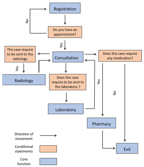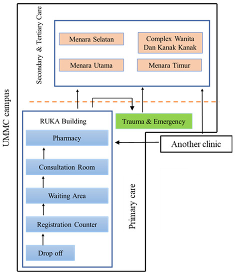 RUKA is divided into five regions: a pick-up/drop-off area, a registration counter, a waiting area, consultation rooms, and a pharmacy. Typically, a patient seeking treatment at RUKA will go through a registration process, a waiting period before consultation with a doctor, and a second waiting period before collecting medicine. The average visitor is expected to follow a path that starts at the pick-up/drop-off location and stops at the registration counter regardless of whether the visitor has booked an appointment or not. Typically, the visitor will have to wait for a turn, be referred to the examination room, and then stop by the pharmacy if medication is to be collected. That would be the end of the journey if payment was not required, according to the Malaysian Ministry of Health’s persons handling guidelines and the person management system (PMS) (see the high-level workflow displayed in Figure 2). Since its opening, the facility has attracted a growing number of patients annually. However, no major renovation that resulted in the alteration of its layout has been carried out, making it a suitable candidate for this research.