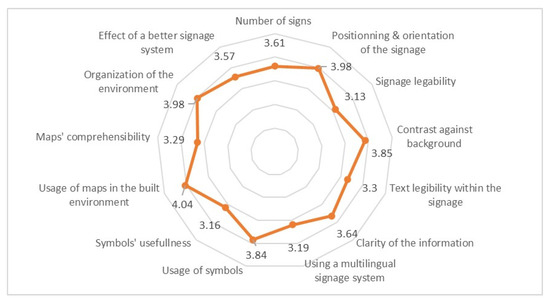 The result on the question investigating the availability of a sufficient number of signs scored a mean response of 3.61 regarding the number of signs available in the built environment with a standard deviation of 0.686, indicating an insufficient number of available signs based on the five-point Likert scale employed in the questionnaire. Similarly, the response to the question investigating the positioning and orientation of the signage scored a mean response of 3.98 with a standard deviation of 0.529, indicating a tendency toward perceptual dissatisfaction regarding the positioning and orientation of the signage (see Figure 5).