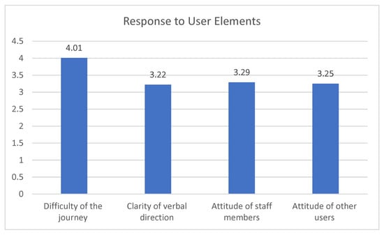 Analysis of the human-related elements within the questionnaire indicated a perceived difficulty with performing wayfinding tasks in the setting and highlighted a potential outcome represented by users having to ask for directions multiple times on average during their journey within the environment. In addition, the analysis of the human-related elements demonstrated a lack of verbal clarity when giving directions and a poor attitude from both staff members and other users toward being asked for directions within the environment. This may be due to a lack of awareness on the part of users who are more familiar with the setting, such as staff members and more experienced users, about the difficulty of the wayfinding process, especially for patients who might be operating under less-than-optimal mental conditions. An institutional intervention might be required in this case to raise the level of awareness and perhaps provide training to staff members to handle such situations.