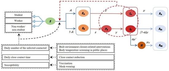 where A is the proportion of asymptomatic infected individuals among the infected; ε′ (day−1) is the rate from the asymptomatic exposed (EA) to the asymptomatic infected (IA); ε (day−1) is the rate from the symptomatic exposed (ES) to the pre-symptomatic infected (PS); γ (day−1) is the rate from the pre-symptomatic infected (PS) to the symptomatic infected (IS); α is the proportion of individuals who chose to be hospitalized during the symptomatic infection period (IS); μ′ (day−1) is the rate from the symptomatic infected (IS) to the hospitalized infected (H); μ (day−1) and μH (day−1) are the removal rate of the non-hospitalized infected (I) and the hospitalized infected (H), respectively; n(t) is the number of infected people contacted (PS, IA, and IS) per day, calculated by Equation (2); tp (h) is the daily close contact time per person, calculated by Equations (3) and (4).