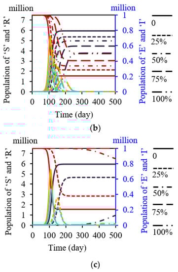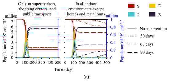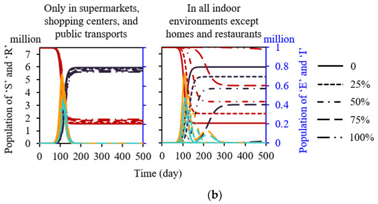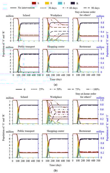 Due to the fact that people did not often wear masks at homes and in restaurants [11], this study only considered two scenarios: only in shopping centers, supermarkets, and public transport; and in all built environments except homes and restaurants (Figure 4). When only wearing masks in shopping centers, supermarkets, and public transport, 5.9 million (74.9%) people would be infected with the SARS-CoV-2, reduced by 5.5% compared with no intervention (Figure 4a). The time and the proportion of implementing interventions had no significant impact on restraining the spread of COVID-19. However, if the mask-wearing could be mandatorily implemented in all built environments except homes and restaurants on the 31th, 61th, and 91th day after the appearance of the first confirmed COVID-19 case, the total number of infections (rate) would be 0.8 million (10.3%), 1.3 million (16.7%), and 2.5 million (33.5%), respectively, and decreased by 87.0%, 78.9%, and 57.7% compared with no intervention (Figure 4a). Assuming that the proportion of the mask-wearing population was 25%, 50%, and 75% in schools, workplaces, shopping centers, and public transports, the total infections would be decreased by 12.7%, 28.4%, and 49.5% compared with no intervention (Figure 4b).