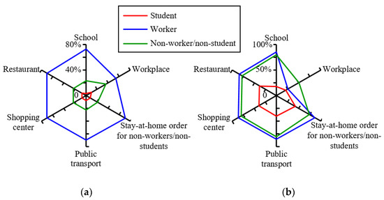 Figure 3a shows the absolute infection rate of the three population groups (student, worker, and non-worker/non-student) among the COVID-19 infections in Hong Kong. When the school closures were implemented, the absolute infection rate of students was the lowest (3.5%) in all built environment interventions. When the workplace closures were implemented, the absolute infection rate of workers was the lowest (53.9%). When stay-at-home orders for non-workers/non-students were implemented, the absolute infection rate of non-workers/non-students was the lowest (21%).