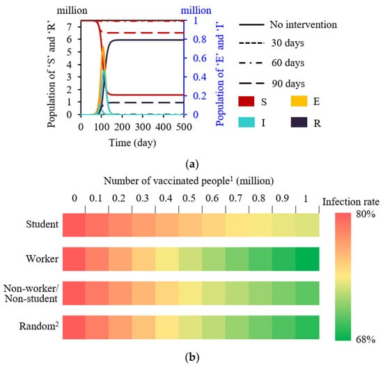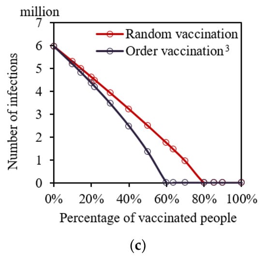 The total infections would be reduced by 99.99%, 99.6%, and 83.8% compared with no intervention if all residents were vaccinated on the 31th, 61th, and 91th day after the first infected case appeared. (Figure 5a). Workers should be prioritized for vaccination, followed by non-workers/non-students and students. If only 1 million people were vaccinated under the order of workers, random, non-workers/non-students, and students, the total infections would be reduced by 0.95 million (16.0%), 0.85 million (14.3%), 0.73 million (12.3%), and 0.43 million (7.3%), respectively, compared with no intervention (Figure 5b). Under the order of vaccination, when the vaccination rate was 60%, the total infections decreased the most, reaching 1.7 million, compared with random vaccination (Figure 5c).