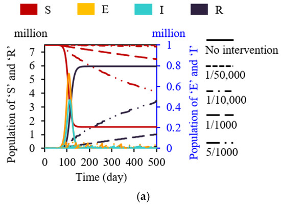 When evaluating the time to implement interventions, the implementation intensity was set to 100%. When evaluating the intensity, it was assumed that the interventions would be implemented 30 days after the first confirmed COVID-19 case appeared. All scenarios were simulated for 500 days.