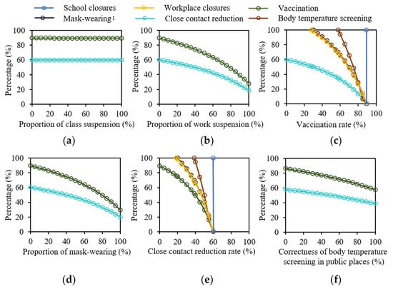 The impact of the proportions (0, 25%, 50%, 75%, 100%) of class suspension, work suspension, stay-at-home orders for non-workers/non-students, public transport closures, shopping center closures, and restaurant closures on the COVID-19 prevention and control are shown in Figure 2b. When the proportion of work suspension was 25%, 50%, 75%, and 100%, respectively, the infection rate dropped by 10.6%, 23.5%, 39.8%, and 61.5%, respectively (Figure 2b).