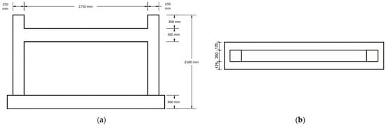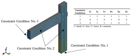 As illustrated in Figure 11, a total of three constraint conditions were used. The first was employed at the bottom of each column by restraining their displacements and rotations in all directions. The second was used at the cut surface of the beam along the “x” direction by restraining the beam’s displacement in the “y” direction and its rotation around the “x” direction. The third constraint condition was applied at the half length of the beam along the “y” direction. This restrained the beam displacements in both the “y” and “z” directions and its rotation around the “x” and “z” directions.