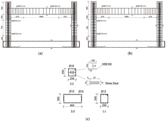 Reinforcement and steel section details of the tested frames: (a) HD; (b) LD; (c) cross-sections [].