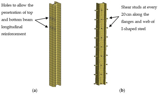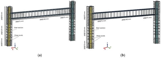 The FE models were based on an experimental study conducted at the Structural Mechanics Laboratory at Atilim University []. The experimental study included the testing of two frames with an RC beam connected to RCS columns, one with high ductile (HD) and the other with low ductile (LD) features. As illustrated in Figure 1 and Figure 2, the cross-sectional area of the columns was 250 by 250 mm. The diameters of the main transverse and longitudinal reinforcements in these columns were 8 and 10 mm, respectively. The column with a low ductile design was constructed with a stirrup spacing of 70 mm at the confinement zone (250 mm length) and 120 mm at the mid-zone (700 mm length). The high ductile column was constructed with a stirrup spacing of 50 mm at the confinement zone (250 mm length) and 120 mm at the mid-zone (700 mm length). These RCS columns included HEB100, I shaped steel sections with headed shear studs that were welded to their flanges and web at every 200 mm. The use of headed shear studs is a very common practice for creating composite action between the structural steel and surrounding concrete [,]. Table 1 lists the details of the steel reinforcement used in these frames (see also Figure 2). The beams had a cross-sectional area of 250 by 300 mm, with main transverse and longitudinal reinforcement diameters of 8 and 12 mm, respectively. The stirrup spacing of the beams used in the frames was 75 mm at the confinement zone (575 mm length) and 140 mm at the mid-zone (1600 mm length). As per the guidelines in the current Turkish Earthquake Code, TEC 2018, there was no difference in the rebar configuration of the low and high ductile beams due to their cross sections and span lengths []. Therefore, the same reinforcement configuration was used for the beams of both frame types. The reinforcement details and their layouts complied with the requirements of TEC 2018 and the Turkish standards for reinforced concrete structures, TS 500 [].