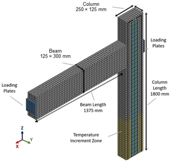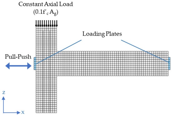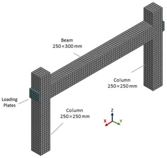 The tested frames were subjected to lateral and gravity loads. Therefore, the same loading pattern was maintained for the analytical study as well. Lateral loads were applied to the frames by using solid rigid plates which were attached to the joints and the midpoint of the beam (Figure 9). Plate deformations that might initiate from this loading were prevented by assigning a rigid material property to the loading plates. The movements of these plates were also restrained so that they would translate in the “x” and rotate around the “y” directions. The contact surface between the plate and the structural frame was modelled using a surface-to-surface contact property by employing a high friction coefficient of 0.9 [,].