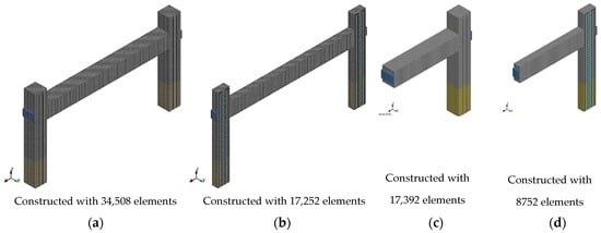 Therefore, the frame was investigated using four individual models: (a) full frame, (b) half the full frame cut along the x-direction, (c) half the full frame cut along the y-direction, and (d) a quarter of the full frame cut in both the x and y-directions (Figure 5). The results of these four models were compared to each other and no significant differences were observed with respect to cracks and failure patterns, load-deflection envelopes, energy dissipation, and stiffness degradation. As a result of these studies, the quarter model, which had the least number of elements, was used in this study for all 12 models since it required the least processing time (Figure 6).