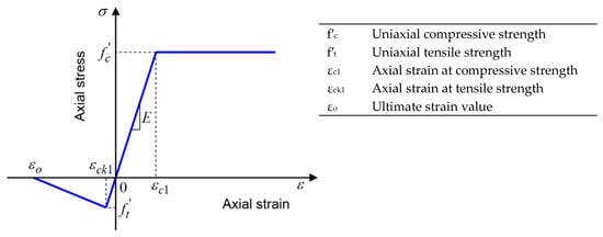 The Winfrith Concrete Model (WCM) was used in the FE analyses (Figure 8). This model involves a smeared crack concrete behavior that propagates forces through crack openings and stores crack openings in concrete while the element is under successive compressive and tensile forces [,,,].