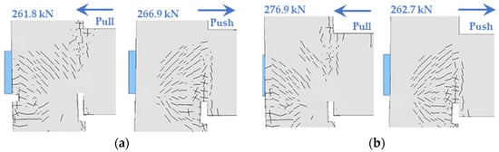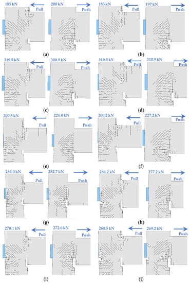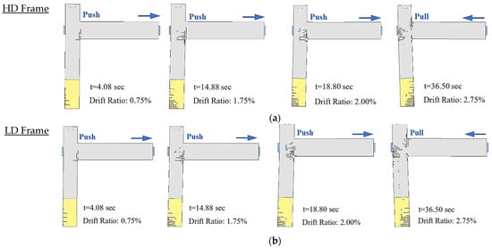 The overall crack patterns of the HD and LD frames were also plotted, as displayed in Figure 14. The crack patterns were captured from the models at varying drift ratios under consequent pull and push forces. The results indicate that the extensive cracks and member erosion (elimination) occurred around the lower and upper column–beam joints.