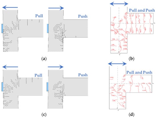 Unlike the cracks of the joints and columns, the concrete damage observed in the RC beams of the tested frames at the 1.75% drift ratio were more severe than those recorded in the beams of the FE models (Figure 13) In fact, during their push cycles, the beams in the FE models exhibited only a few cracks at the bottom surface near the column joint area (i.e., not extending further into the beam). This damage pattern was attributed to the number of extensive cracks occurring specifically in the lower corner of the column beam joint due to the energy dissipation concentrated on the joint. This prevented the occurrence of further cracks in the beam. However, when the FE model was subjected to pull, the cracks in the column beam joint were noticeably fewer and therefore more energy dissipated into the beam causing more cracks. These results clearly indicate that frame failure was initiated by the cracks in the lower corner of the column–beam joint when the frame was subjected to push. Therefore, it is important to pay close attention to the details of the lower column–beam joint, since it would be more efficient to strengthen the lower joint if the lateral load capacity of the frame had to be increased.