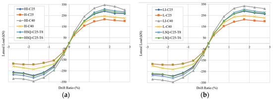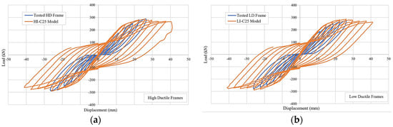 Hysteresis loops illustrate the change in the lateral load versus displacement relationship. The load versus displacement relationships of the HI-C25 and LI-C25 models were compared to those of the tested frames (Figure 15a,b). The hysteresis curves indicated that there was a very good correlation at the peak loads of each loading cycle between the tested frames and FE models. However, pinching behavior led to some variation in the hysteresis loops, which was one of the phenomena observed during frame testing []. Pinching had a severe impact beyond the 0.5% drift ratio, which was the result of the continuous widening and propagation of cracks at the column–beam joints during subsequent pull and push cycles. After each of these cycles, the cracks followed a pattern of widening and tightening, since the frames were eventually brought back to their initial condition at rest (the stage where the applied latter load was zero). It is believed that the continuous widening and closing of the crack cycles caused severe pinching in the tested frames once the cracks were formed at the 0.5% drift ratio. As previously studied, pinching is heavily dependent upon structural system characteristics (such as material and connection types) and the loading protocol (the number of loading cycles, the total test duration, and the sequence of loading cycles) []. However, the models in the FE analyses lacked this pinching behavior. This resulted in a noticeable difference in their hysteresis loops, specifically beyond the 0.5% drift ratio.
