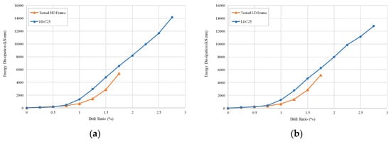 Energy dissipation of the tested frames and models: (a) HI-C25; (b) LI-C25.