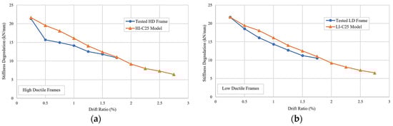 Stiffness degradations of the tested frames and models: (a) HD frames; (b) LD frames.