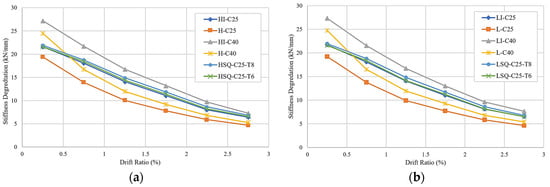 Compared to C25, the concrete class of C40 provided a higher stiffness degradation value at the initial drift ratio of 0.25% (Figure 20). However, as the drift ratio increased to 2.75%, the separation in the stiffness degradation curves of these two materials for both the HD and LD frame models became less noticeable. Out of all the models, the HI-C40 and LI-C40 models provided the greatest stiffness. The models with square-shaped structural steel columns exhibited very similar stiffness degradation patterns to those with I-shaped steel ones.