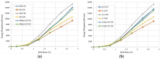 The frame models showed similar energy dissipation patterns at initial drift ratios up to 0.75%. Beyond this drift ratio, the HI-C40 and LI-C40 models displayed higher energy dissipation abilities when compared to the others (Figure 21). The lowest energy dissipation abilities were observed in the H-C25 and L-C25 models with non-composite columns. The results indicated that the presence of structural steel section in a column, regardless of its shape, had a positive impact on the energy dissipation characteristics of a frame.