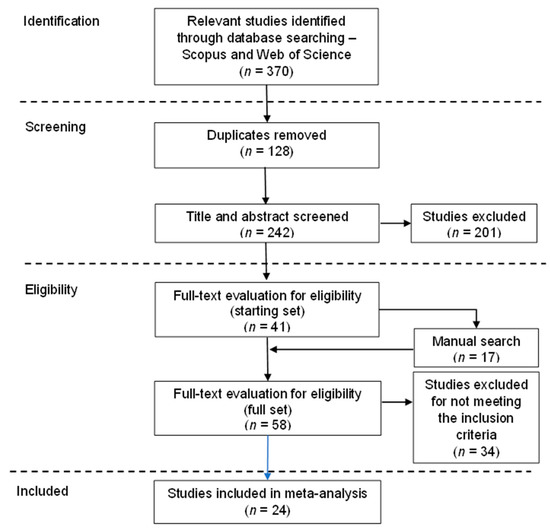 An MS Excel spreadsheet was used to perform a structured full-text evaluation process by recording the relevant details including the authors’ names, publication types, publication years, countries or locations of study, types of project examined (e.g., general building, civil engineering, or international project), data collection and measurement techniques, sample sizes, number of factors examined, and identities of sample respondents. For studies with missing details, the authors attempted to consult the respective authors. Furthermore, manual searching was essential in this eligibility phase to minimise possible bias arising from missing relevant studies in the selection process [41]. The manual search process commenced by searching references from the included studies (i.e., the starting set of 41 studies). The consecutive steps to increase and refine the yield of manual searching involved tracking ‘related articles’ and ‘cited by’ articles using the identified references in the Google Scholar search engine and requesting the full texts via interlibrary loans as required. An additional 17 references were obtained via manual searching and these references were subjected to full-text evaluation for eligibility. The spreadsheet enabled a comprehensive review of the studies for identifying the dominant research focus and statistical measurement technique. A total of 24 studies were selected for the meta-analysis based on the following inclusion criteria: