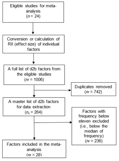 In performing the data extraction process as illustrated in Figure 2, spreadsheets were used to record the list of factors and to perform the calculations or conversions as the data needed for meta-analyses are often reported in diverse formats [43]. It started with the conversion or calculation of the RII (i.e., the effect size) for individual factors. The equation of RII is given below: