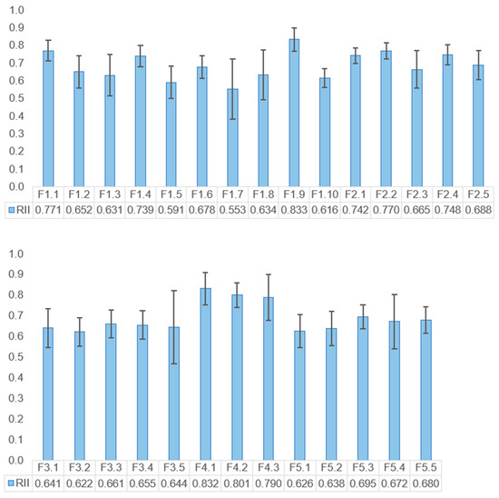 Figure 3 shows the weighted RII and 95% confidence intervals (i.e., the error bars) of individual factors. As expected, some factors have relatively large confidence intervals. This can be explained because the standard errors and confidence intervals will always be larger under random-effects model specification, since it has considered both within-studies and between-studies variances [44]. It is noted that the confidence intervals are larger for factors with lower weighted RII (for e.g., F1.7, F1.8, F3.4, and F5.4), indicating lower precision that can be attributable to the variances between studies on these factors.