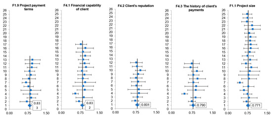 Lastly, Figure 4 shows the forest plots, which are the usual way to illustrate meta-analyses results. These forest plots are only presented for the top five factors identified in the study because of the space limitations in this paper. Each forest plot displays the effect estimates and confidence intervals at 95% level of confidence of individual studies (i.e., individual block markers with error bars with study ID on Y-axis) and effect summary from the meta-analysis (i.e., the diamond marker with error bar at the bottom, ID = 1). For all five factors, as expected, the effect estimates of individual studies would not line up in a row since a particular effect size is assumed to vary from one study to the next under the random-effects model specification. The diamond marker crossed by a vertical line parallel to the y-axis, which denotes the effect summary, further demonstrates the variations between studies that made different contributions to the effect summary estimate. For example, in the forest plot for factor ‘the history of client’s payments in past projects (F4.3)’, two studies crossed the line (study ID 7 and 9) and the numbers of studies that contributed positively and negatively to the effect summary are five and four, respectively—that is, five studies on the right-hand side (positive contribution) and four studies on the left-hand side (negative contribution) of the vertical line. Next, the error bars denote that the width of confidence intervals of some individual studies are rather wide, indicating less precision in the respective studies. Nonetheless, the concern of precision in meta-analysis is over the precision of the effect summary rather than the precision of individual studies [44]. In this case, the precision of the effect summary is not a concern since the width of the confidence intervals of the individual effect summary of all top five factors (i.e., the diamond markers) are approaching zero.