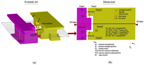 The finite element model of the entire bridge and the local hinge model are illustrated in Figure 1b and Figure 2a separately, where the limiting devices in the hinges, including longitudinal restrainers, transverse compression pads and vertical bearings, and pounding elements, are all simulated. In addition, elastic-plastic simulation of element 1–4 of hinge is focused on, because the potential seismic damage could happen at the root of element 2 and element 3, proven in Wu and Sun’s study [5].
