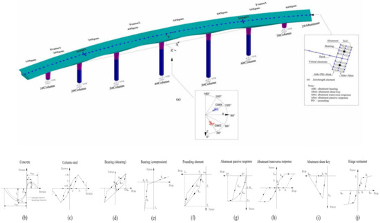Numerical model: (a) entire bridge; (b) confined and unconfined concrete; (c) longitudinal reinforcement in column; (d) bearing (shearing direction); (e) bearing (compression direction); (f) pounding; (g) abutment passive performance; (h) abutment transverse response; (i) shear key; (j) hinge longitudinal restrainer.