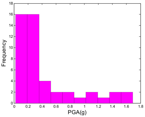 A suite of 48 artificial ground motions [53,54], was selected to be the dynamic loads during fragility analyses. Figure 3 shows the histogram of PGAs for the suit of ground motions. Nonlinear time-history analysis of the bridge model was performed subjected to each ground motion, and the probabilistic seismic demand parameters, including regression coefficients a and b, dispersion σ, regression accuracy coefficient R2, illustrated in Table 2, can be acquired through regression analyses. Regression analysis diagrams of eight components are illustrated in Figure 4.