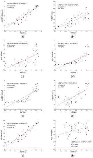 The higher R2 value signifies the stronger linear relationship and the lower dispersion between the variables of interest [23]. Consequently, obviously seen in Table 2, the linear relationships between the engineering demand parameter (EDP) of components including Column, Abb, HmcY, HmcZ, Abts and the ground motion intensity PGA in logarithmic space are strong, and the dispersion are low. The minimum R2 value corresponding to the component of Absk, with the value of 0.187, is acceptable compared with the minimum R2 value of 0.18 from the study of DesRoches et al. [55].