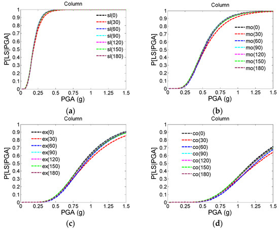 Seismic fragility curves of the column subjected to different excitation angles in the (a) slight; (b) moderate; (c) extensive; and (d) complete limit states.