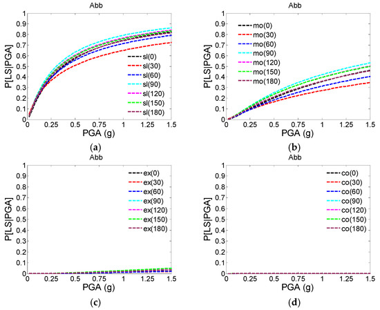 Seismic fragility curves of Abb subjected to different excitation angles in the (a) slight; (b) moderate; (c) extensive; and (d) complete limit states.