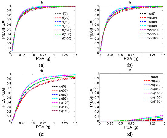 Seismic fragility curves of Hs subjected to different excitation angles in the (a) slight; (b) moderate; (c) extensive; and (d) complete limit states.